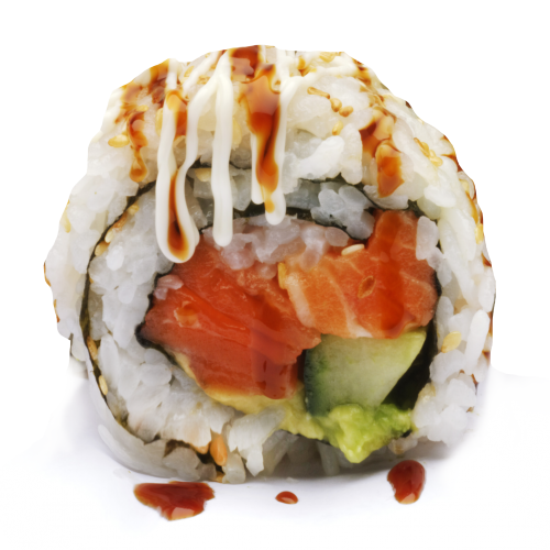 Reverse roll of NZ Salmon with Single Avocado and Cucumber, drizzled with Japanese Mayonnaise and Teriyaki Sauce and Sprinkles of Toasted Sesame Seeds